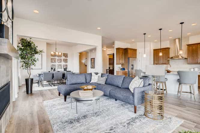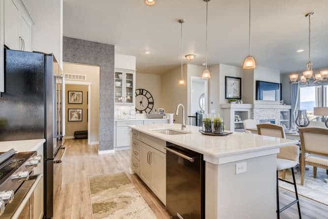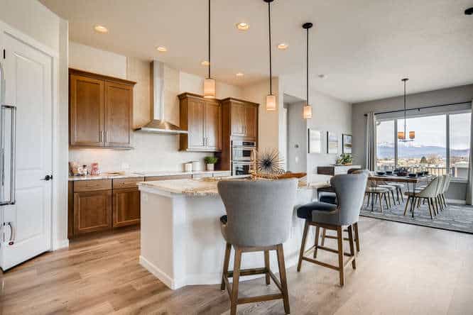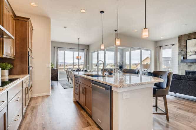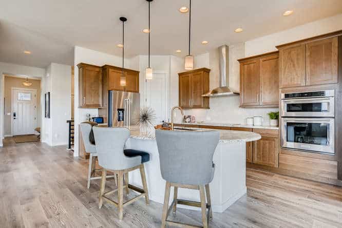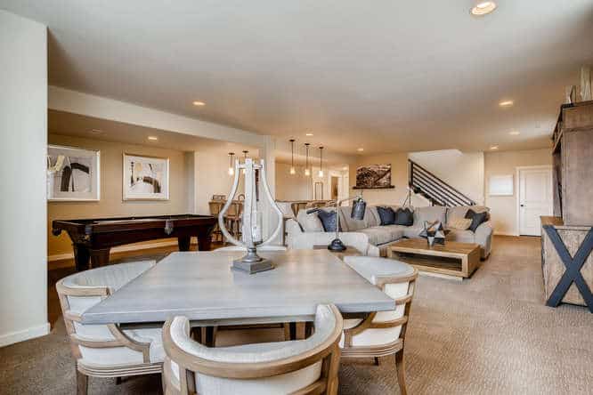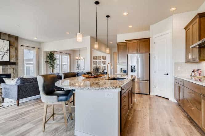 The Celebration is one of Classic Homes’ newest ranch plans. It offers 3,220 square feet of family-style living space with an open floor plan concept, where the kitchen, coffee bar, dining nook and great room come together in true harmony. Ample seating areas and the large kitchen island create the ideal setting for family celebrations and gatherings. The wall of windows along the family room, with a sliding glass door for easy access to the backyard, makes indoor/outdoor entertaining a breeze. Whether you’re looking for your first home or your last, the flow of this floor plan is as refreshing as it is smart. The main-level master suite is truly an owner’s retreat with its large walk-in closet, barn door to the master bathroom, and plenty of room to relax. The main level also includes a second bedroom and full bath, conveying a thoughtful approach to main-level living. The family-friendly finished basement showcases a spacious recreation room with built-in wet bar. Two additional bedrooms provide a substantial amount of space to comfortably accommodate and entertain family and friends, while still offering privacy for extended-stay guests. The Celebration comes with 2.5- and 3-car tandem garages.