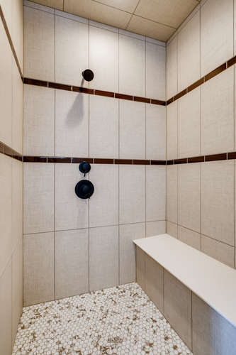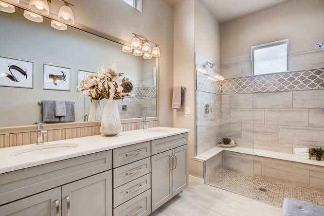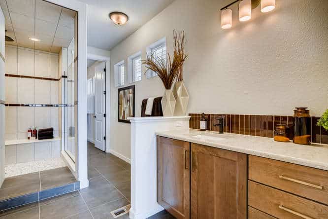 Master Countertop: Hanstone Ivory Wave E with backsplash of Copper Brown 2×8 in vertical straight lay on back wall only
