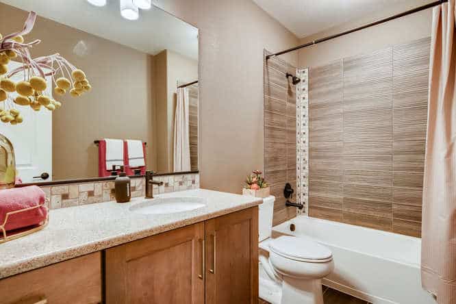 Bath Countertop: Hanstone Quartz Victoria Sands D with backsplash of MZ Achaeology UL38 Crystal River Strip Mosiac Mesh 12×12