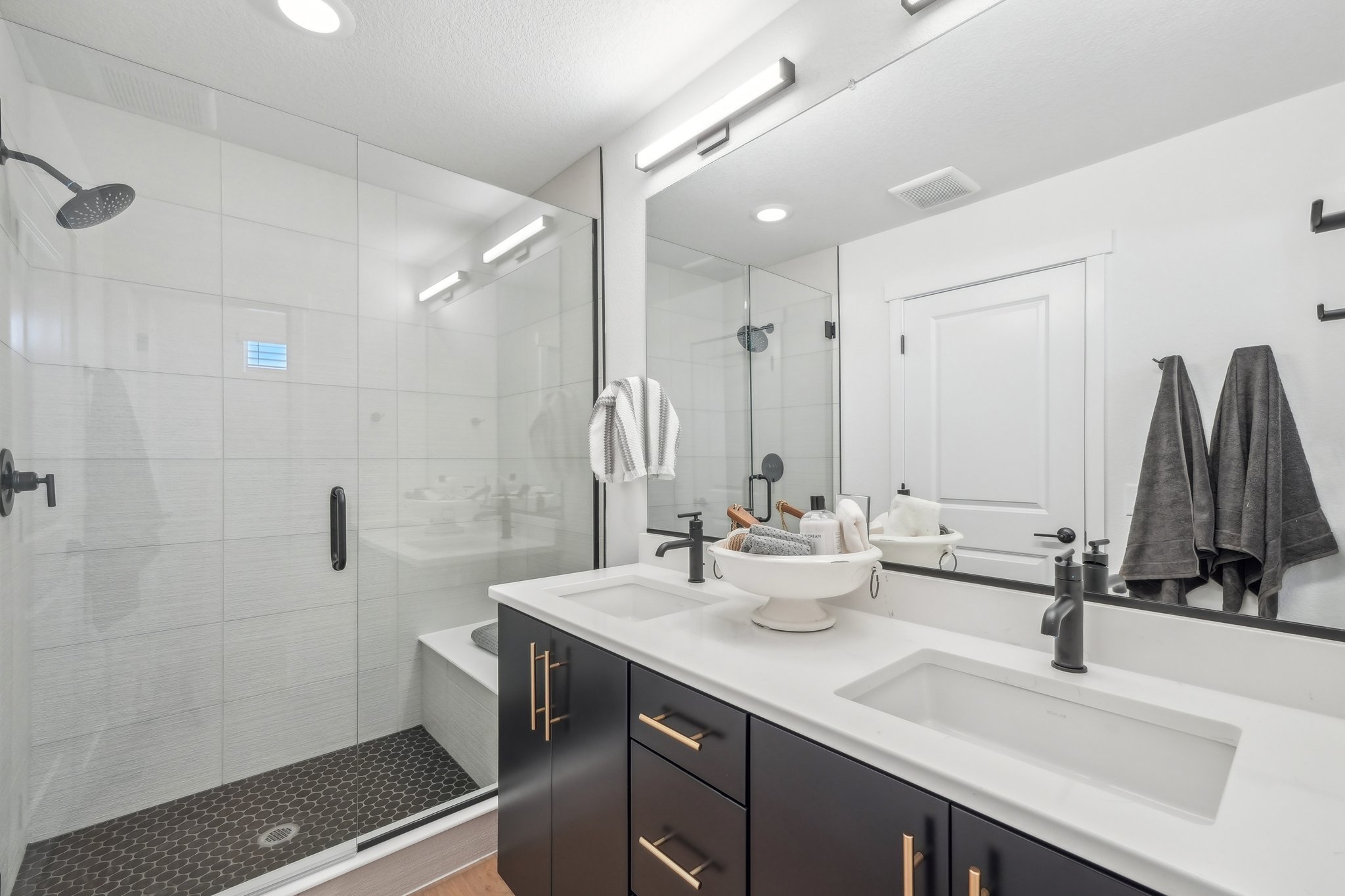 - Undermount double vanity lavs (per plan)